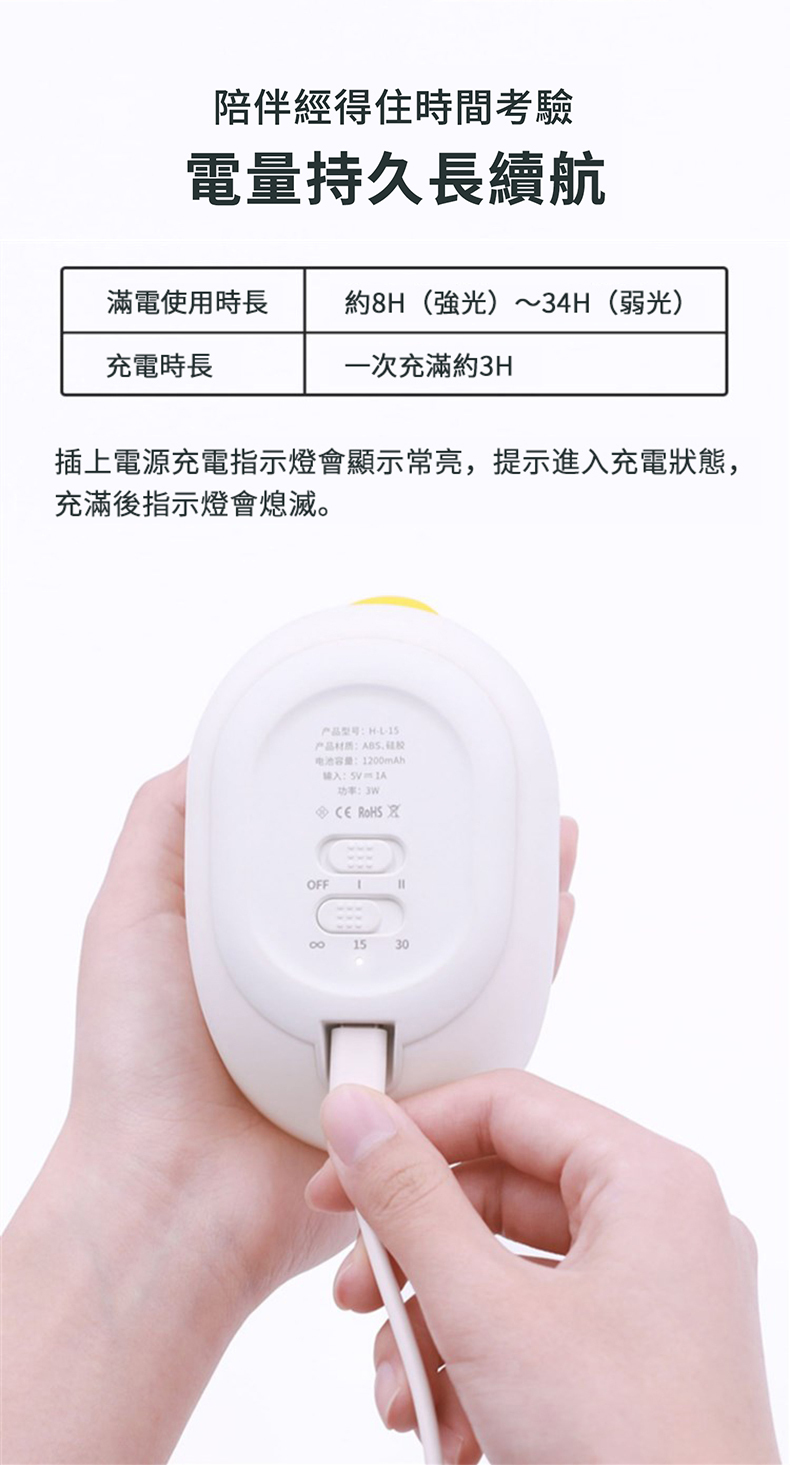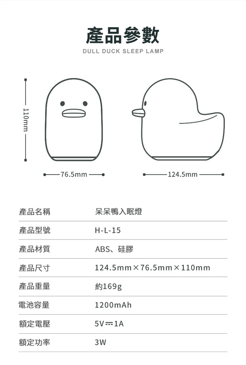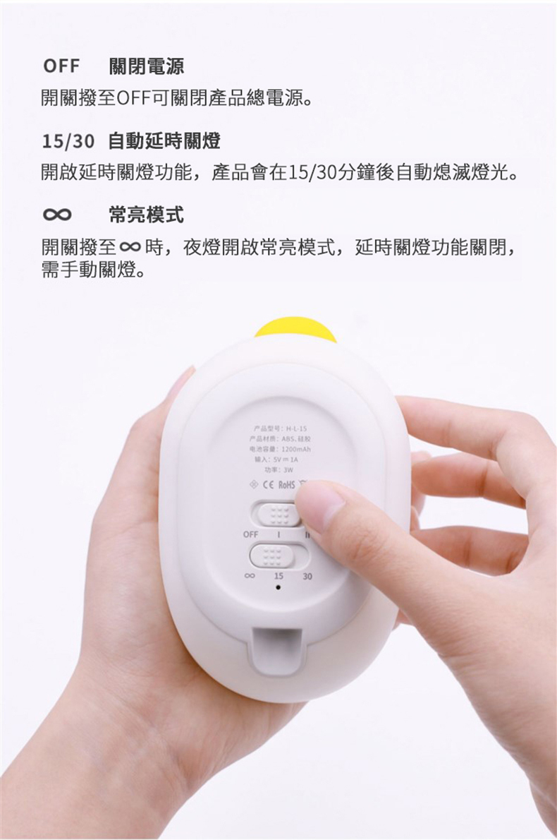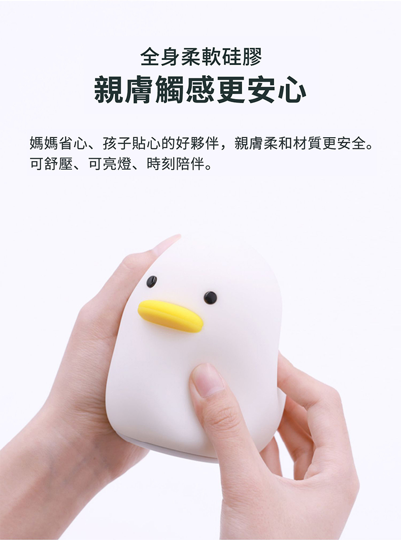 Lovely and cute duck-shaped night light, the whole body is made of soft silicone and has a skin-friendly touch. Two levels of brightness can be switched at need, and the warm light is soft and comfortable to help you fall asleep easily. The operation is simple and convenient. Just pinch the silicone lampshade or tap the duckling's body to turn on/off the night light. Automatically turn off the lights after a delay, providing a considerate sleeping companion, giving you a peace of mind. Long-lasting battery life, up to 8-34 hours of use, USB charging, convenient and fast. The Ducky Night Light is a good sleeping partner for the baby and a good helper for the mother to wake up at night.