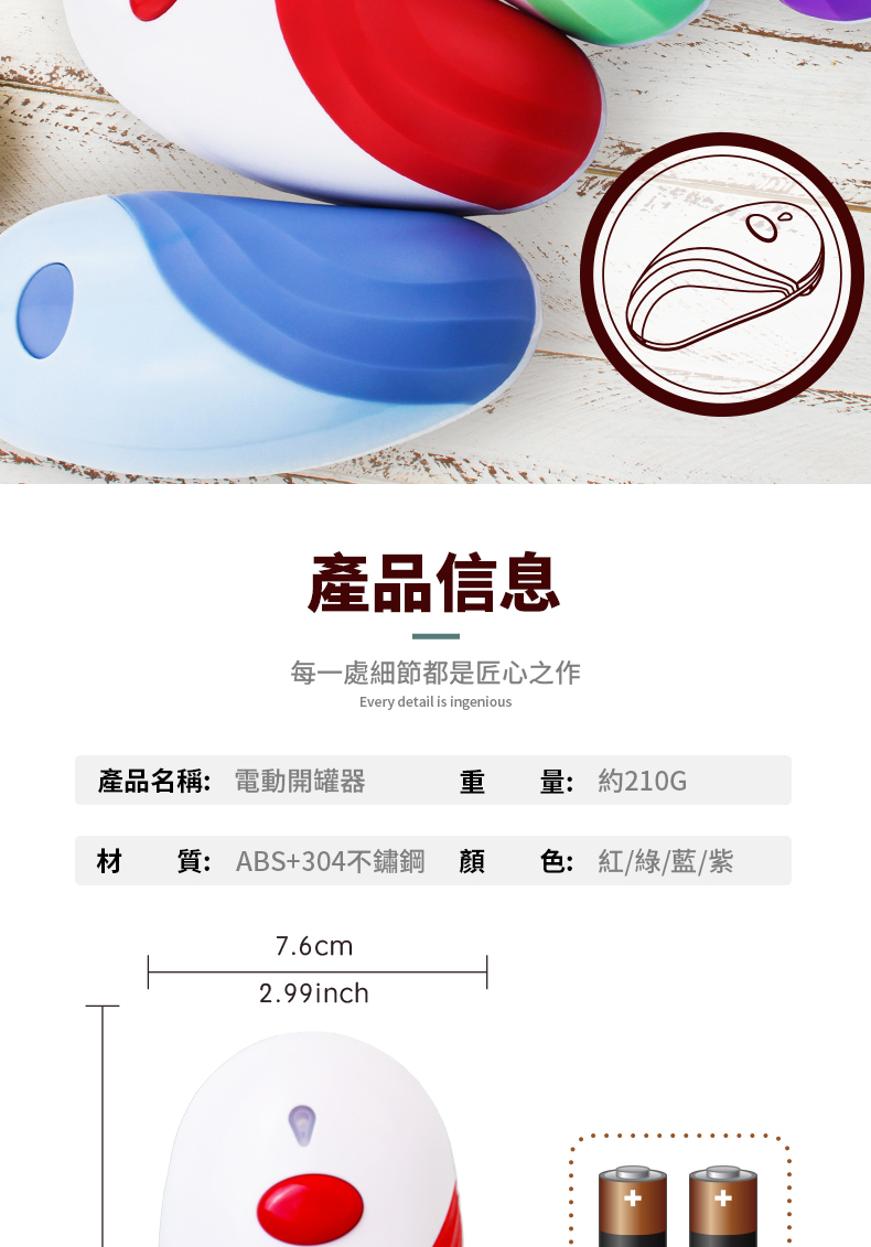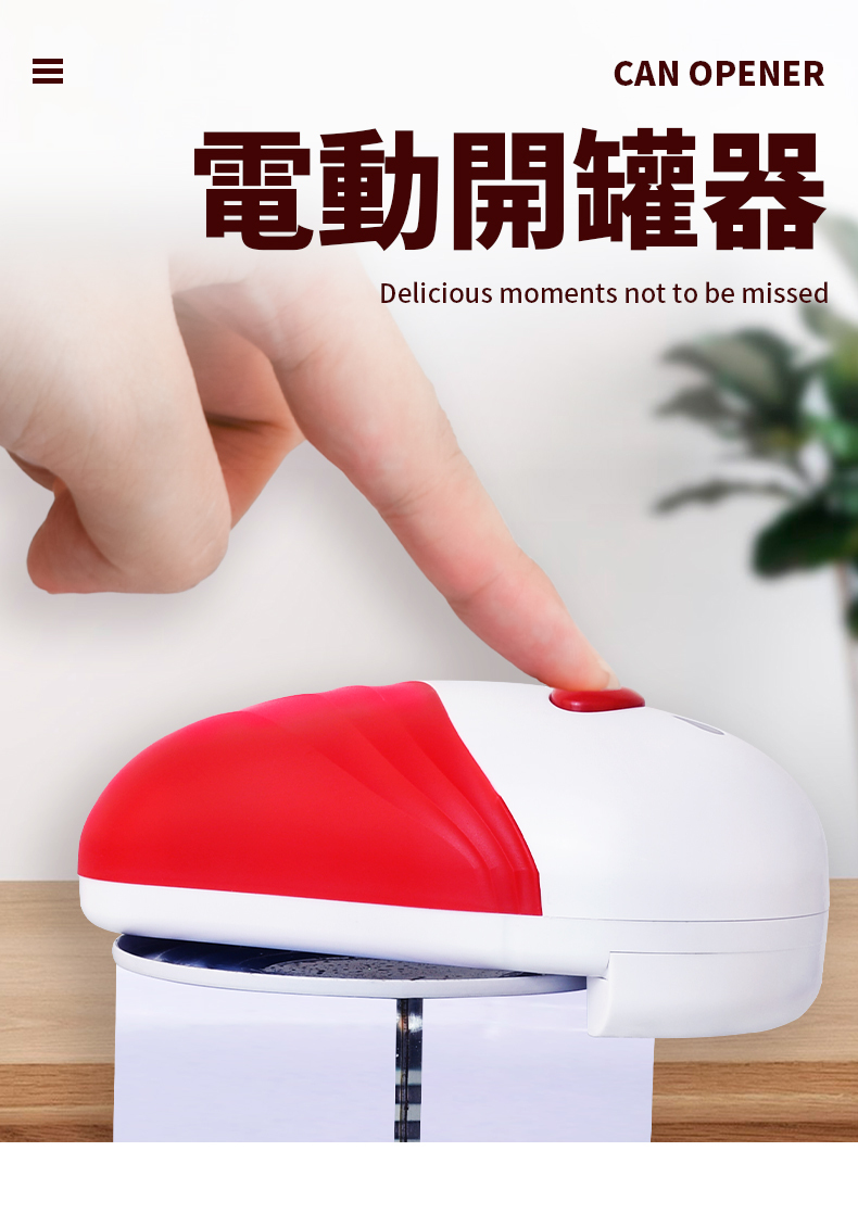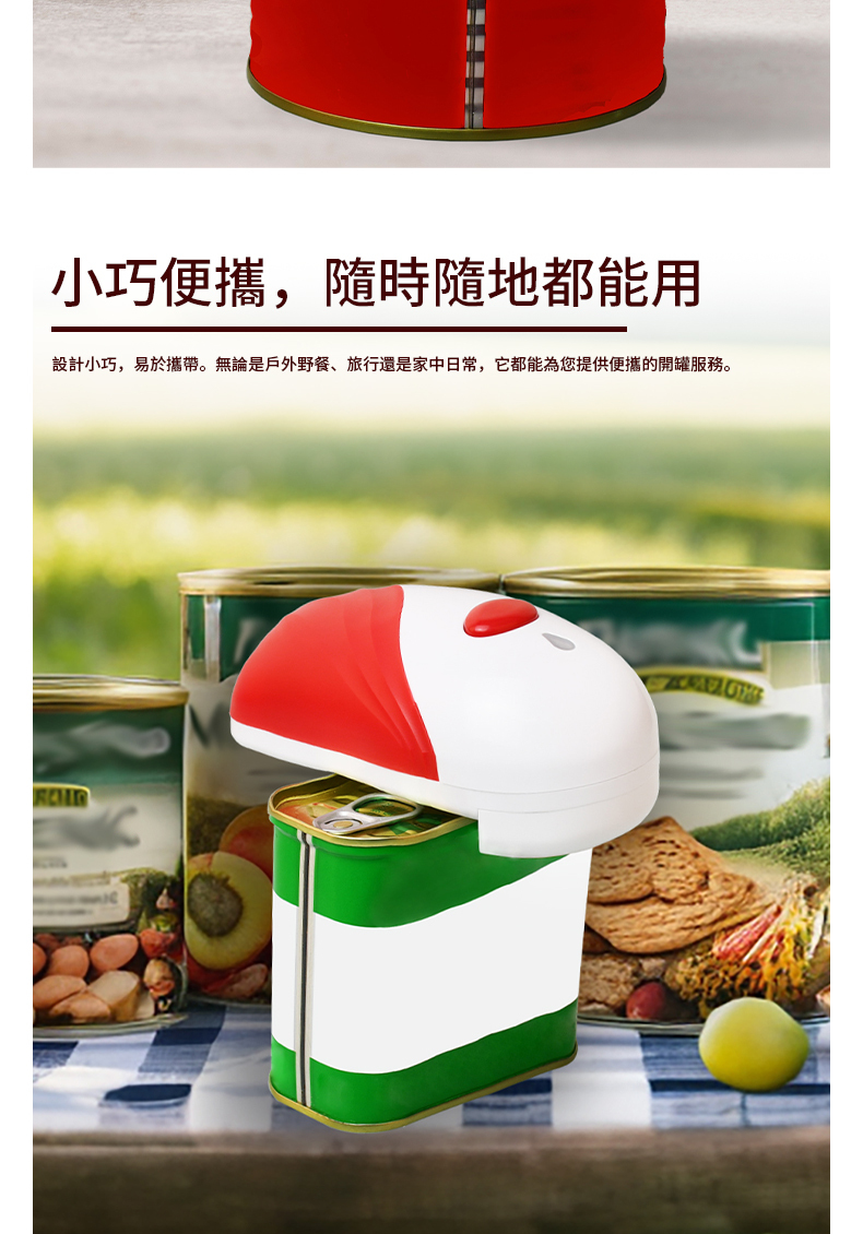 - 安全貼心設計, 產品必須放在罐頭上然後按掣才會啟動