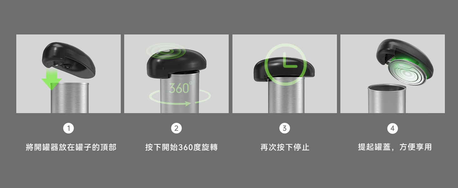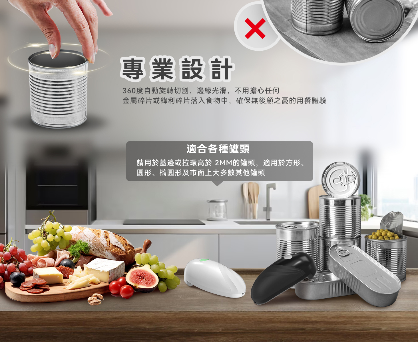 - 安全貼心設計, 產品必須放在罐頭上然後按掣才會啟動