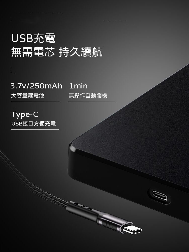 - USB充電:使用Type-C USB接口充電,免去使用電芯的煩惱