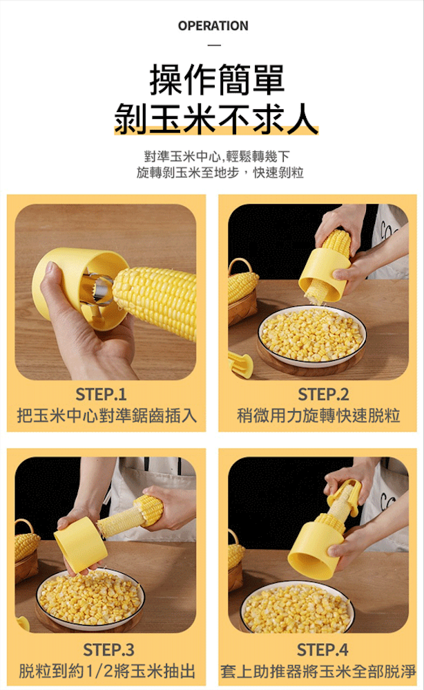 - 只需扭動並推進粟米,便可簡易快捷地將整條粟米刨成粒粒。
