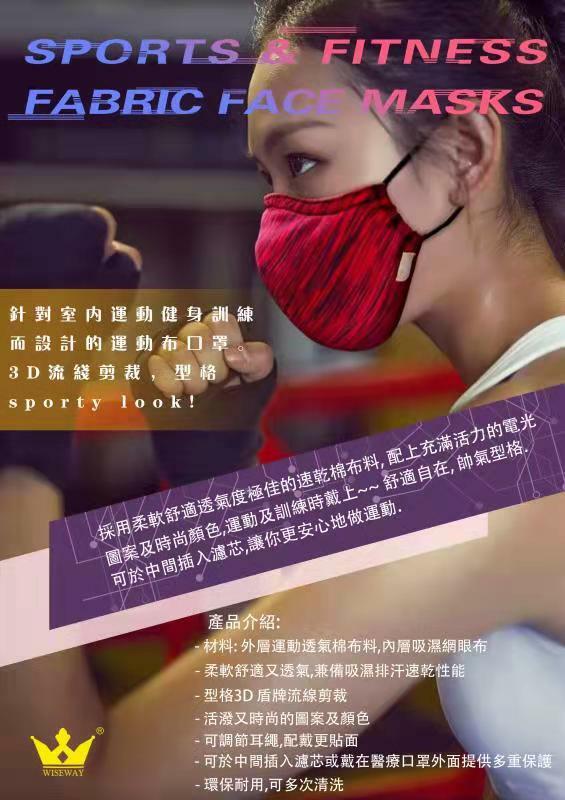 針對室內運動健身訓練而設計的運動布口罩. 3D流線剪裁, 型格sporty look. 採用柔軟舒適透氣度極佳的速乾布料再加上充滿活力的電光圖案及時尚顏色, 運動及訓練時戴上, 舒適自在. 如有需要可於中間插入濾心棉, 預防運動時吸入污染物讓你更安心.